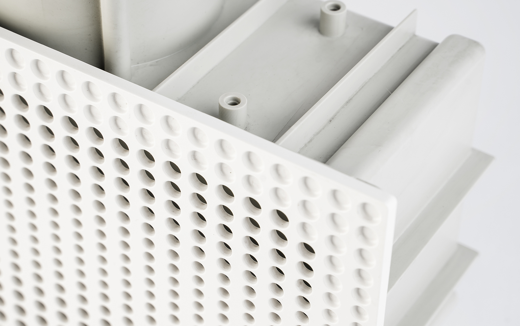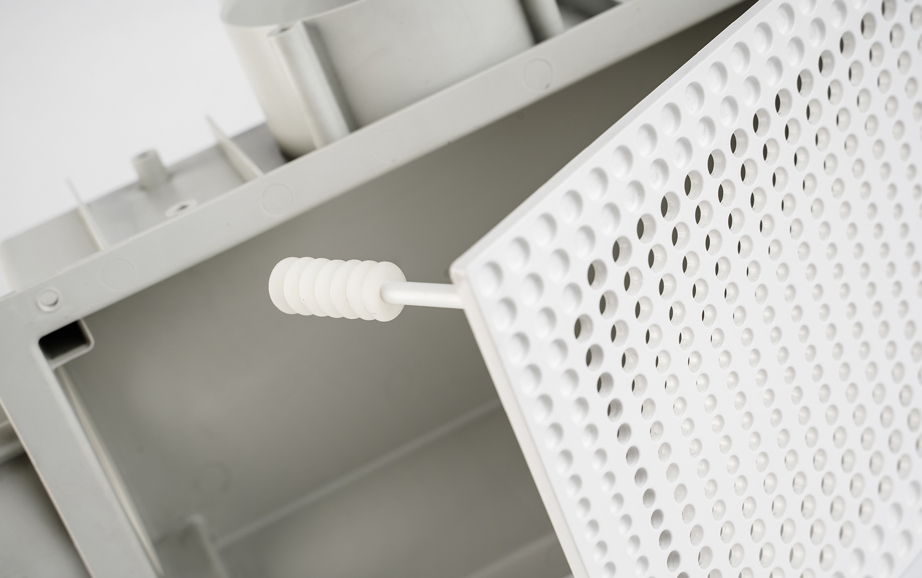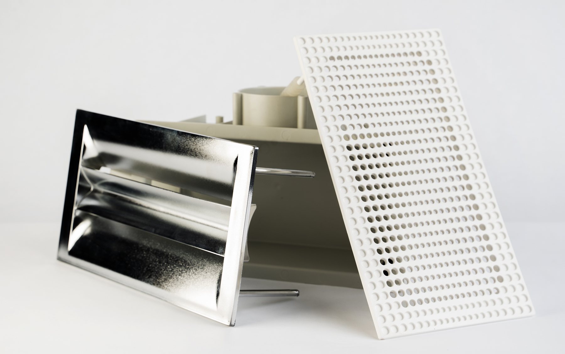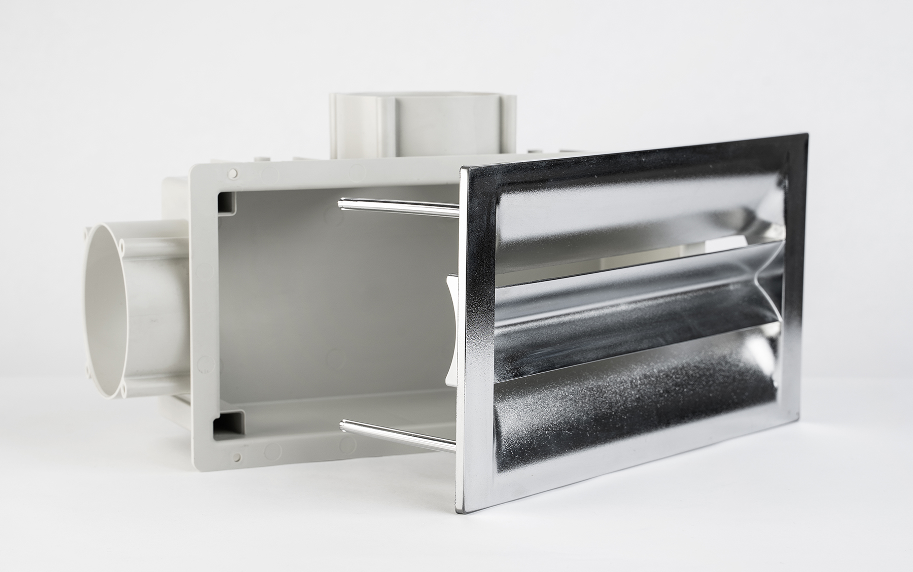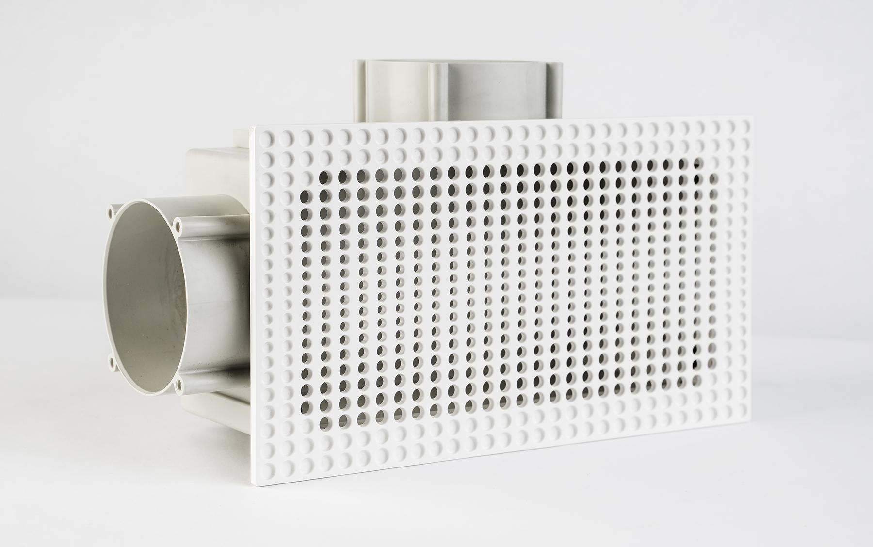 În domeniul distribuției forțate a aerului, obiectivul clientului a fost de a reproiecta o componentă de ventilație prin reducerea greutății și a dimensiunilor acesteia, fără a compromite performanțele funcționale. Intervenția a necesitat, de asemenea, o îmbunătățire a aspectului și o revizuire generală a procesului de producție, cu eliminarea materialelor metalice și a prelucrării secundare în favoarea unor soluții mai eficiente.